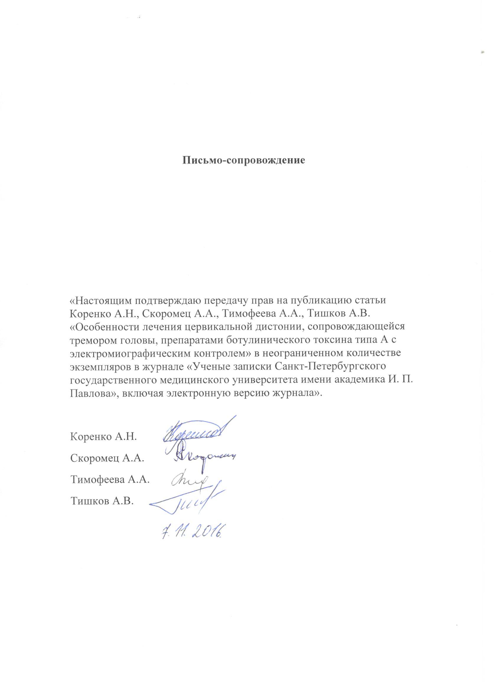 ОСОБЕННОСТИ ЛЕЧЕНИЯ ЦЕРВИКАЛЬНОЙ ДИСТОНИИ, СОПРОВОЖДАЮЩЕЙСЯ ТРЕМОРОМ ГОЛОВЫ, ПРЕПАРАТАМИ БОТУЛИНИЧЕСКОГО ТОКСИНА ТИПА А С ЭЛЕКТРОМИОГРАФИЧЕСКИМ КОНТРОЛЕМ