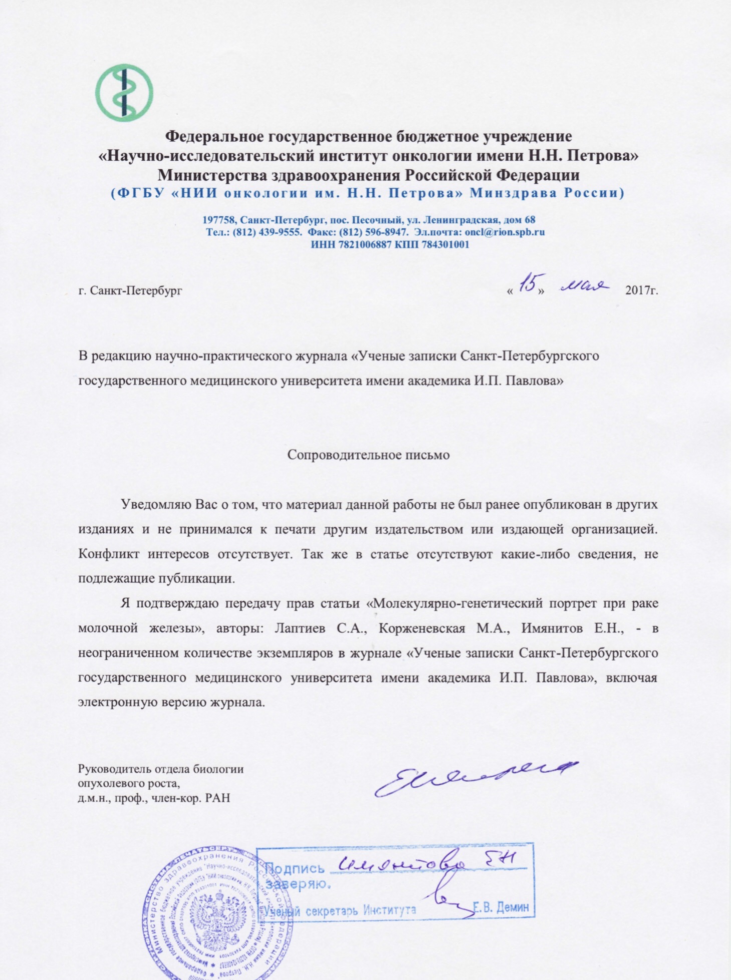 рук. отд. биологии опухолевого роста НИИ онкологии им. Н.Н. Петрова, д.м.н., проф., член-кор РАН