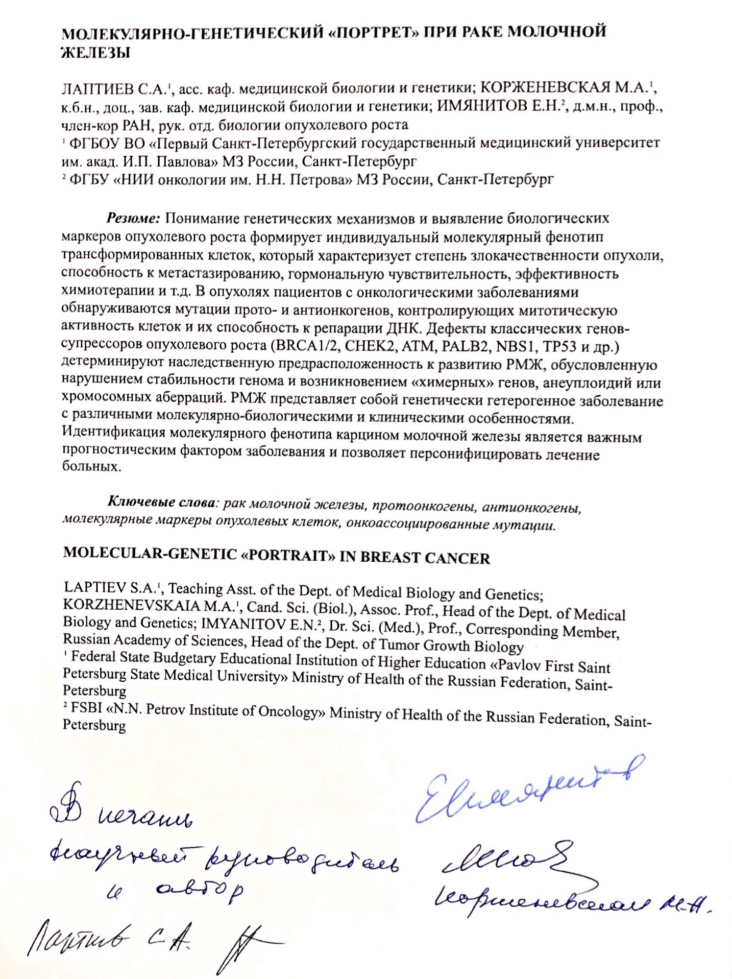 Laptiev S.A., Korzhenevskaia M.A., Imyanitov E.N. MOLECULAR-GENETIC «PORTRAIT» OF BREAST CANCER. The Scientific Notes of the Pavlov University. 2017;24(2):12-22. (In Russ.) https://doi.org/10.24884/1607-4181-2017-24-2-12-22